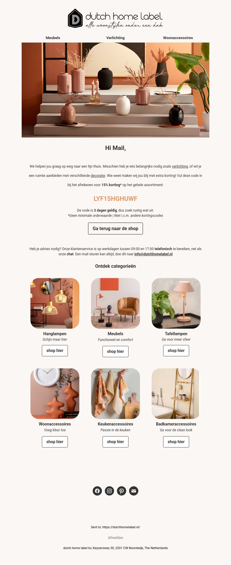 Bij Dutch Home Label krijg je nu 15% korting op je hele winkelmandje! Gebruik de code LYF15HGHUWF bij het afrekenen. Deze aanbieding geldt voor alles in de winkel, van meubels tot verlichting en woonaccessoires. Mis het niet! De code is slechts 3 dagen geldig.