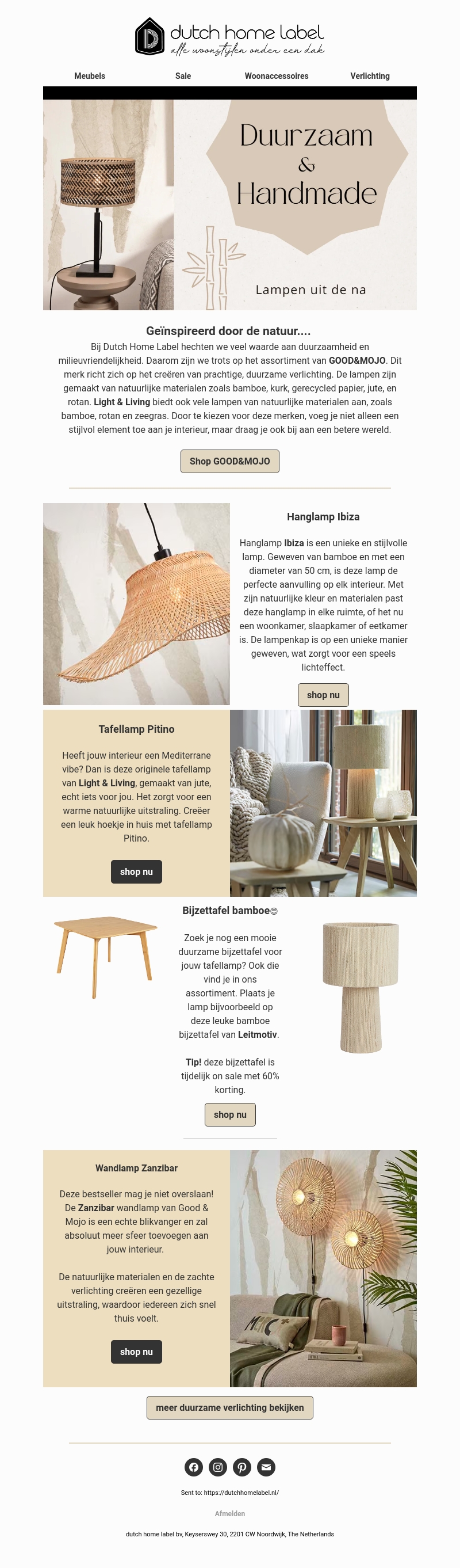 Bij Dutch Home Label hechten we veel waarde aan duurzaamheid en milieuvriendelijkheid. Ontdek ons assortiment van GOOD&MOJO en Light & Living, gemaakt van natuurlijke materialen zoals bamboe en kurk. Deze lampen voegen niet alleen stijl toe aan je interieur, maar dragen ook bij aan een beter milieu.