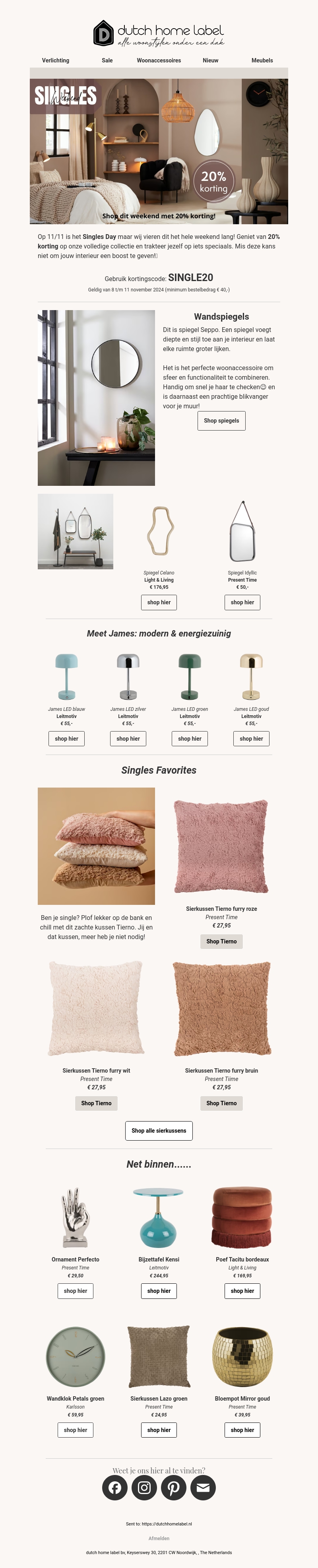 Vier Singles Day met een exclusieve 20% korting op de gehele collectie van Dutch Home Label. Van stijlvolle wandspiegels tot energiebesparende lampen en comfortabele sierkussens, er is voor ieder wat wils. Gebruik de code SINGLE20 bij je bestelling. Mis deze kans niet om je interieur een boost te geven!
