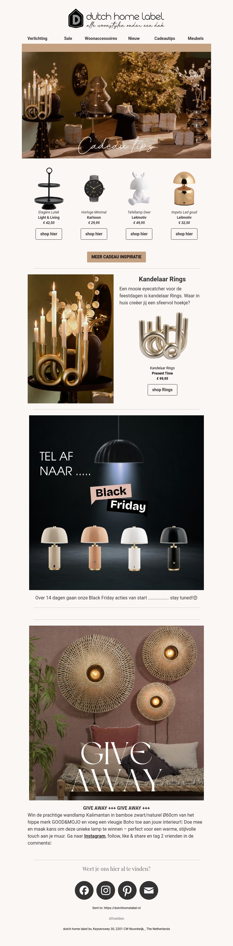 December is de maand van cadeaus en gezelligheid. In deze nieuwsbrief geven we je inspiratie voor feestelijke cadeaus met een stijlvolle twist. Van elegante kandelaars tot moderne tafellampen, we hebben voor ieder wat wils. Ontdek ook onze exclusieve Black Friday aankondigingen! Doe mee met onze Instagram giveaway en win een prachtige wandlamp. Shop de beste deals en maak van dit seizoen een onvergetelijke tijd.
