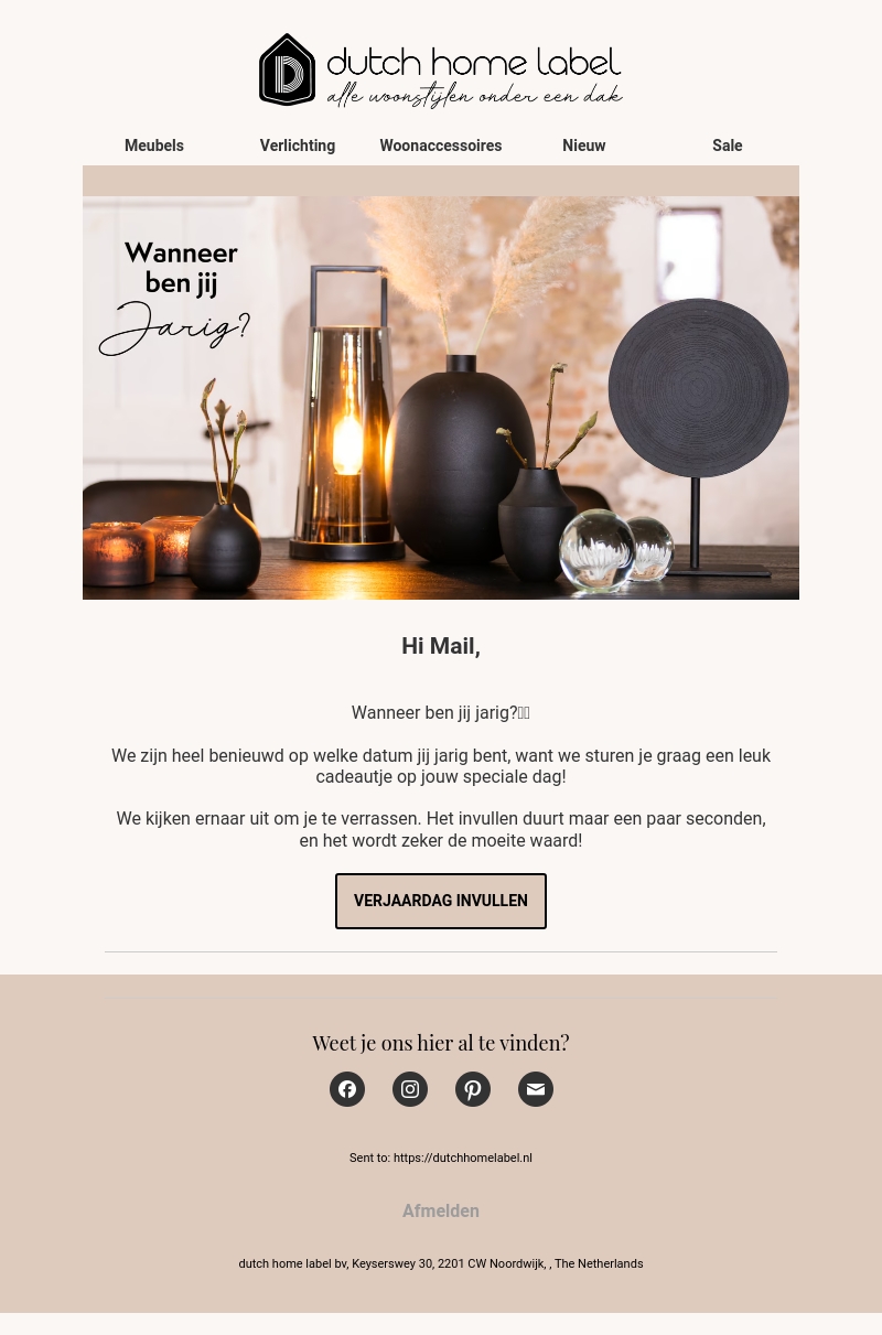 We zijn benieuwd wanneer je jarig bent! Vul je verjaardag in en krijg een leuk cadeautje van Dutch Home Label op jouw speciale dag. Deze actie duurt slechts enkele seconden en is zeker de moeite waard.