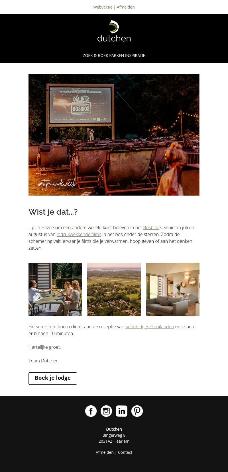 Beleef een magische filmervaring onder de sterrenhemel bij het Bosbios in Hilversum! Duinloges biedt je de kans om tijdens de zomermaanden te genieten van indrukwekkende films in de natuur. Huur een fiets bij de Suitenloges Gooilanden en bereik Bosbios binnen tien minuten. Boek nu je lodge en maak je zomer onvergetelijk.
