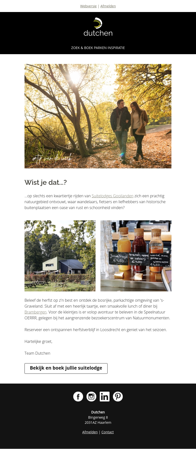 Ontdek de bosrijke en parkachtige omgeving van 's-Graveland, op slechts een kwartiertje rijden van Suitelodges Gooilanden. Geniet van heerlijke herfstactiviteiten zoals wandelen, fietsen, en een bezoek aan het bezoekerscentrum van Natuurmonumenten. Sluit de dag af met een smakvolle lunch of diner bij Brambergen.