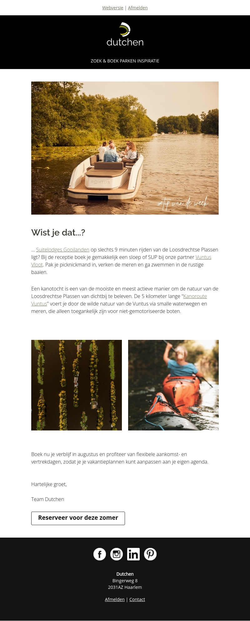SuiteLodges Gooilanden ligt op slechts 9 minuten rijden van de Loosdrechtse Plassen. Boek gemakkelijk een sloep of SUP bij onze partner Vuntus Vloot. Verken de meren, ga zwemmen in de rustige baaien, of geniet van een kanotocht door de Vuntus. Flexibele aankomst- en vertrekdagen in augustus mogelijk.