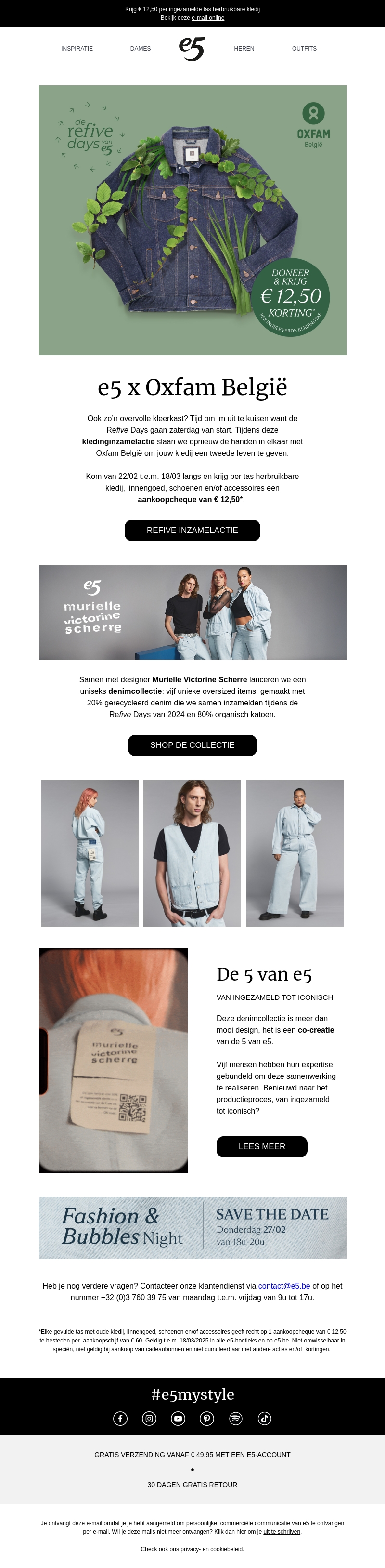 De Refive Days van e5 starten binnenkort in samenwerking met Oxfam België. Dit is een kans om je overvolle kledingkast op te ruimen en tegelijk te profiteren van een aankoopcheque ter waarde van €12,50. De actie loopt van 22 februari tot en met 18 maart en biedt een unieke collectie gemaakt met 20% gerecycleerd denim.