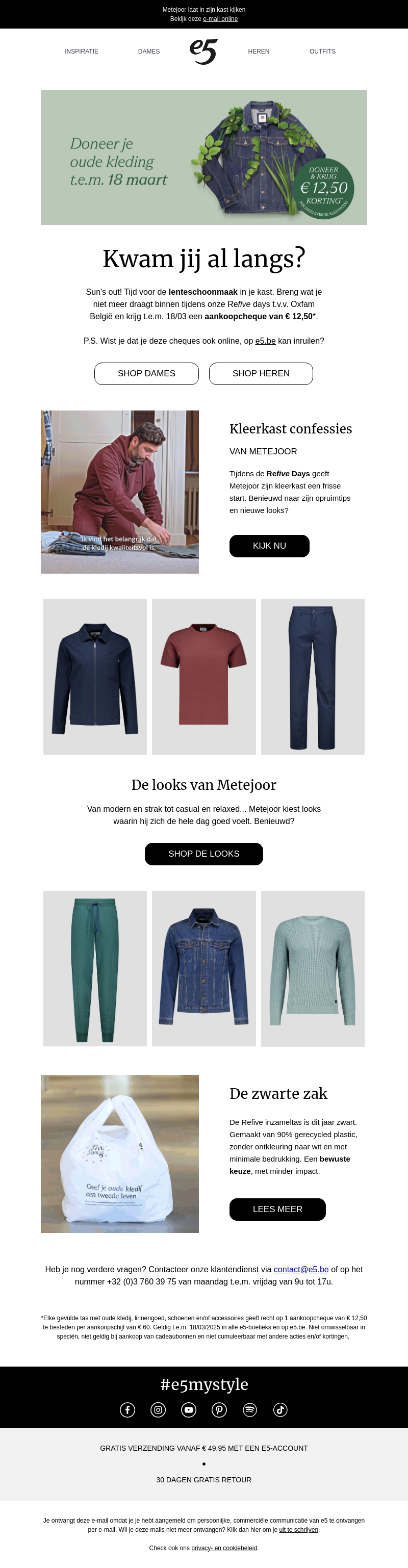Bezoek de Refive Days bij e5 voor een lentekorting. Doneer oude kleding en ontvang een aankoopcheque van €12,50. Maak kennis met de opfrissende looks van Metejoor en geniet van duurzame keuzes. Ontdek de moderne en casual mode voor dames en heren. Bekijk nu en profiteer van exclusieve aanbiedingen.