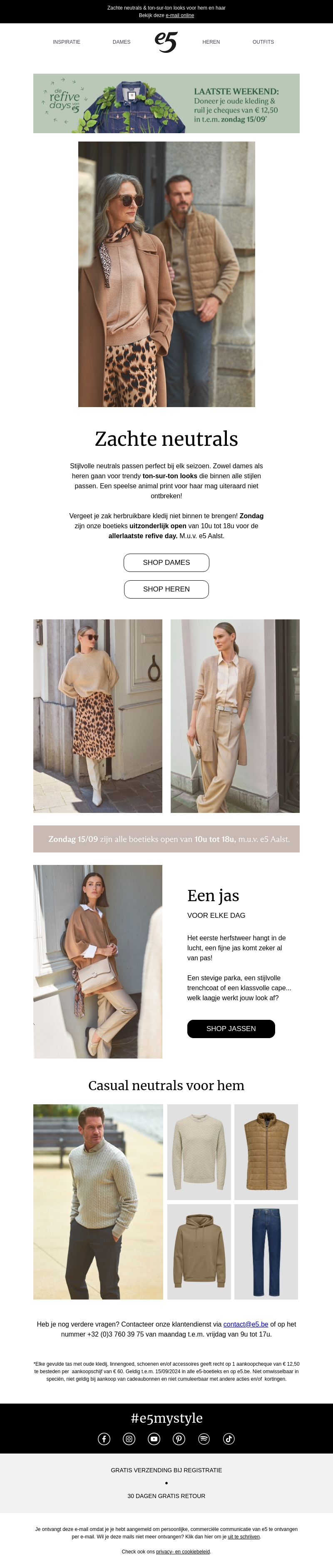 Stijlvolle zachte neutrals passen perfect bij elk seizoen. Kom langs tijdens onze laatste refive days en geniet van trendy ton-sur-ton looks en een speciale animal print. Vergeet je oude kleding niet mee te nemen voor ruil- en donatievoordeel. Zondag zijn onze boetieks open van 10u tot 18u.