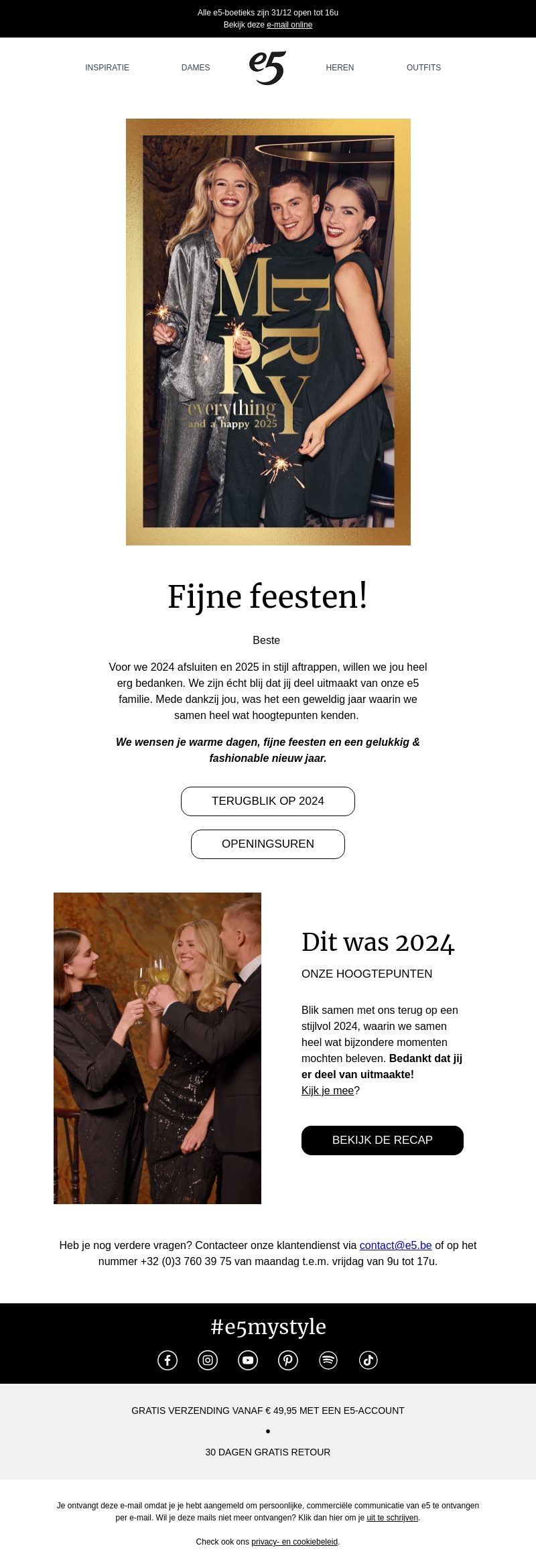 E5 nodigt je uit om 2024 stijlvol af te sluiten en 2025 met sprankeling te beginnen. Ontdek de hoogtepunten van het jaar en bereid je voor op een fashionable nieuw jaar. Bedank voor je bijdrage aan onze successen. We wensen je warme dagen en een gelukkig jaar toe.