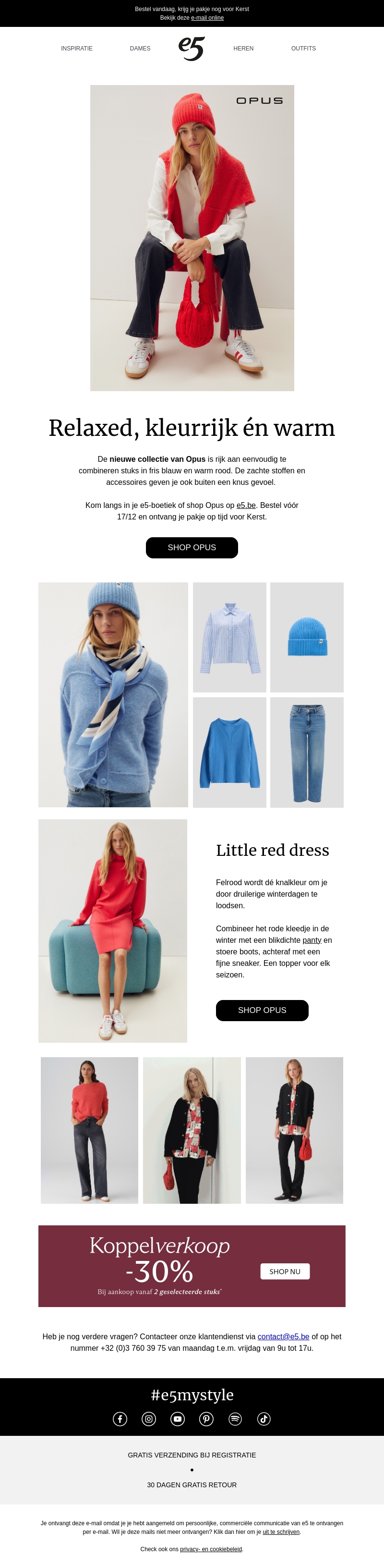 Verken de nieuwe collectie van Opus met een mix van warme roodtinten en frisse blauwen. Perfect te combineren voor stijlvolle winterdagen. De zachte stoffen en accessoires bieden comfort en elegantie. Shop nu en ontvang je outfit op tijd voor Kerst in de e5 boetieks of online.