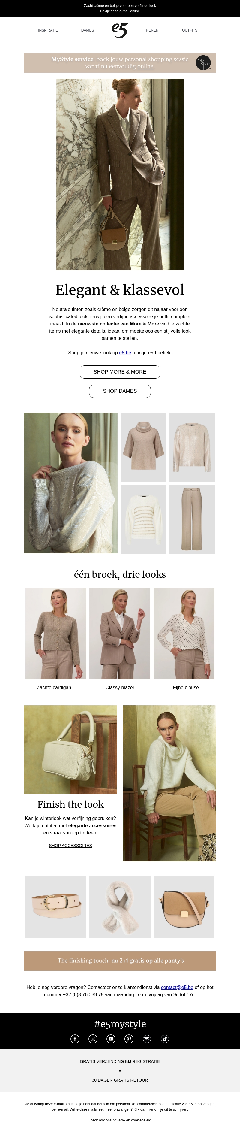 De nieuwste collectie van More & More brengt elegante en stijlvolle items met verfijnde details. Ontdek neutrale tinten zoals crème en beige voor een verfijnde herfstlook. Combineer deze met accessoires voor de perfecte afwerking. Profiteer nu van de aanbieding: 2+1 gratis op alle panty's. Winkel online op e5.be of in je plaatselijke e5-boetiek.