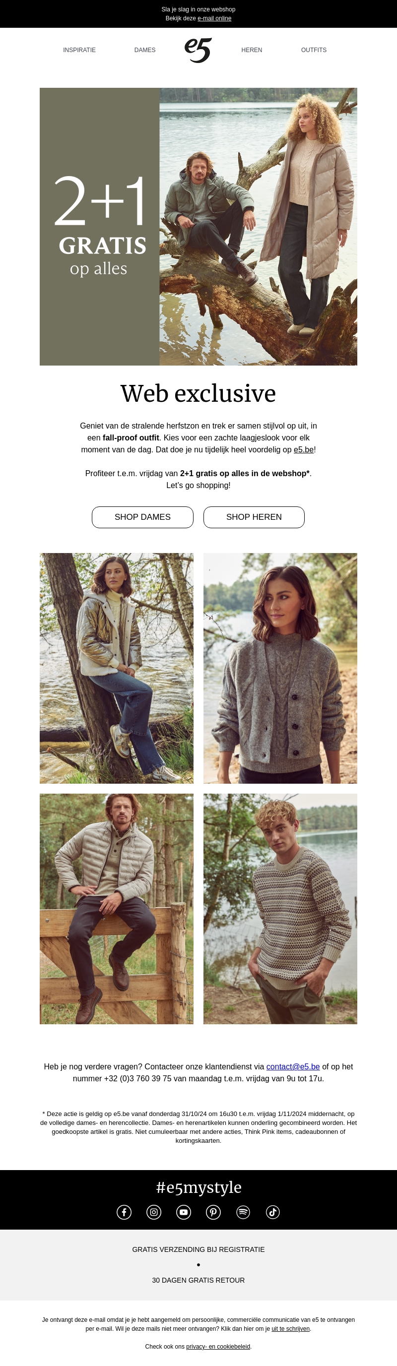 Geniet van het herfstseizoen met stijlvolle outfits dankzij de 2+1 gratis actie bij e5. Bezoek de e5 website en ontdek de nieuwste dames- en herencollecties. Deze exclusieve online promotie biedt een perfecte gelegenheid om te vernieuwen.