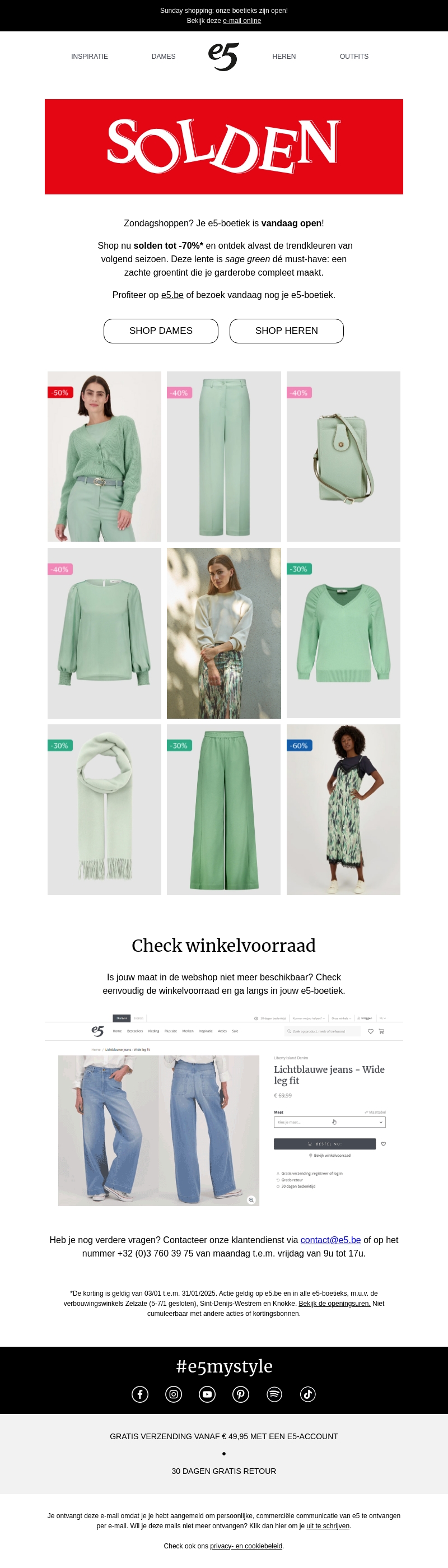 Shop op zondag bij een open e5-boetiek en ontdek kortingen tot 70% op de nieuwste modekleuren. Deze lente is sage green dé must-have trend die je garderobe compleet maakt. Bezoek e5.be of kom langs in je lokale e5-boetiek voor de beste aanbiedingen en unieke stijlen. Mis deze kans niet om je garderobe te updaten met trendy kledingstukken.