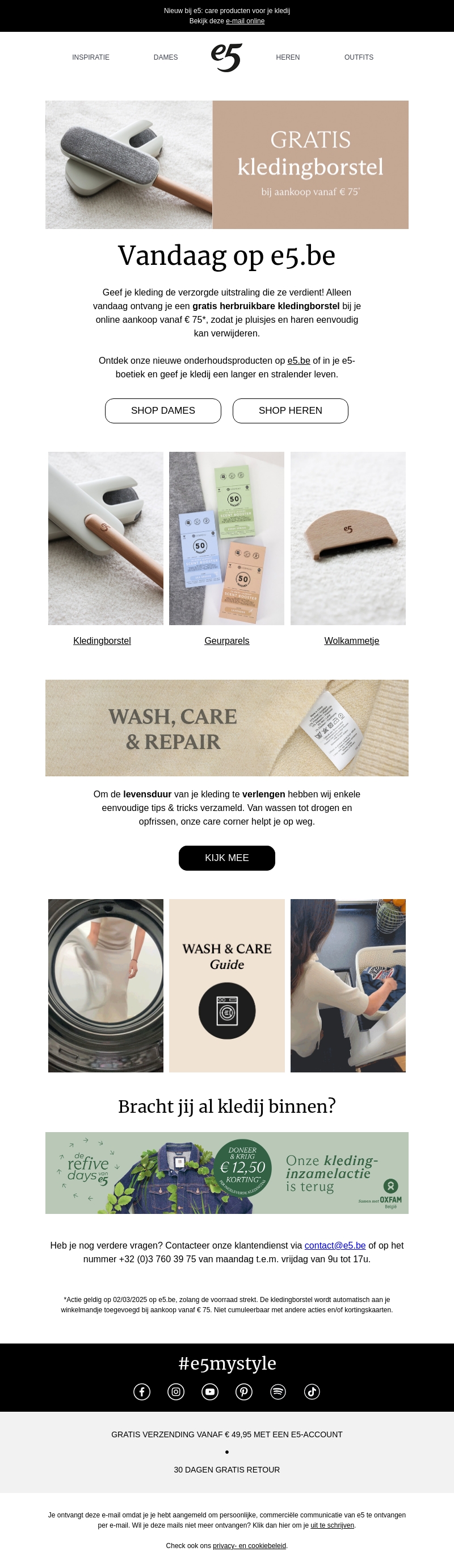 Geef je outfits de verzorgde uitstraling die ze verdienen! Alleen vandaag ontvang je een gratis herbruikbare kledingborstel bij je online aankoop vanaf €75 bij e5. Ideaal om pluisjes en haren eenvoudig te verwijderen. Ontdek ook de nieuwste verzorgingsproducten op e5.be en straal elk seizoen. Shop nu en geniet van deze exclusieve aanbieding!