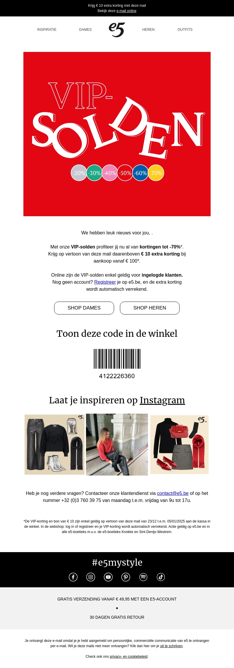 Profiteer nu van de grote VIP-solden bij e5 met kortingen tot wel 70% op geselecteerde items. Haal extra voordeel door deze mail te tonen in de winkel en ontvang een bijkomende €10 korting bij aankopen vanaf €100. Deze actie is exclusief voor ingelogde klanten. Vergeet niet om uw e5-account te registreren voor online voordelen.