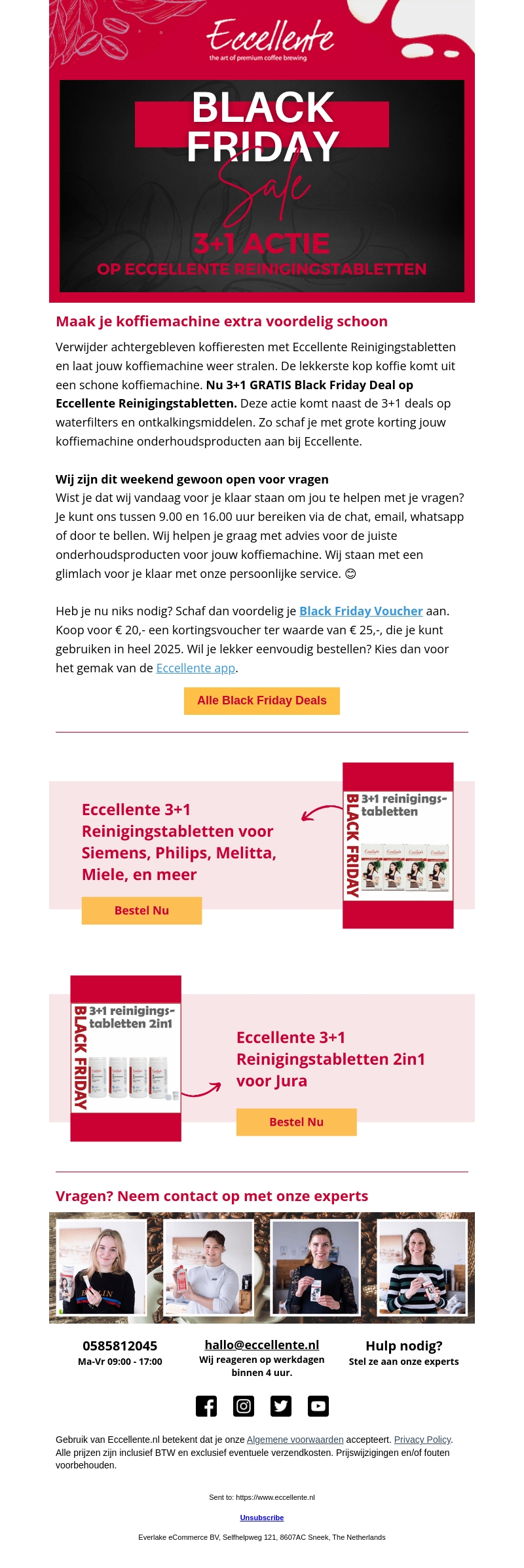 Maak je koffiemachine extra voordelig schoon met Eccellente Reinigingstabletten. Deze Black Friday profiteer je van 3+1 gratis op deze onmisbare onderhoudsproducten. Vergeet niet je kortingsvoucher van €20,- à €25,- te gebruiken. Onze experts staan klaar om je te helpen via chat of telefoon.