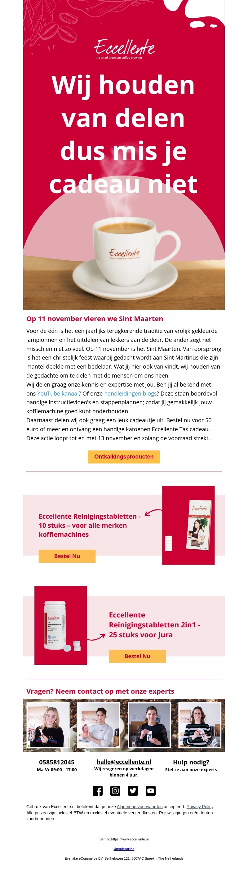 Vier Sint Maarten op 11 november met Eccellente! Geniet van speciale aanbiedingen zoals onze unieke Reinigingstabletten voor koffiezetapparaten en ontvang een gratis katoenen tas cadeau bij aankoop. Bekijk onze handleidingen en instructievideo's om meer uit je koffiemachine te halen. Deze promotie is geldig tot en met 13 november, dus grijp je kans zolang de voorraad strekt!