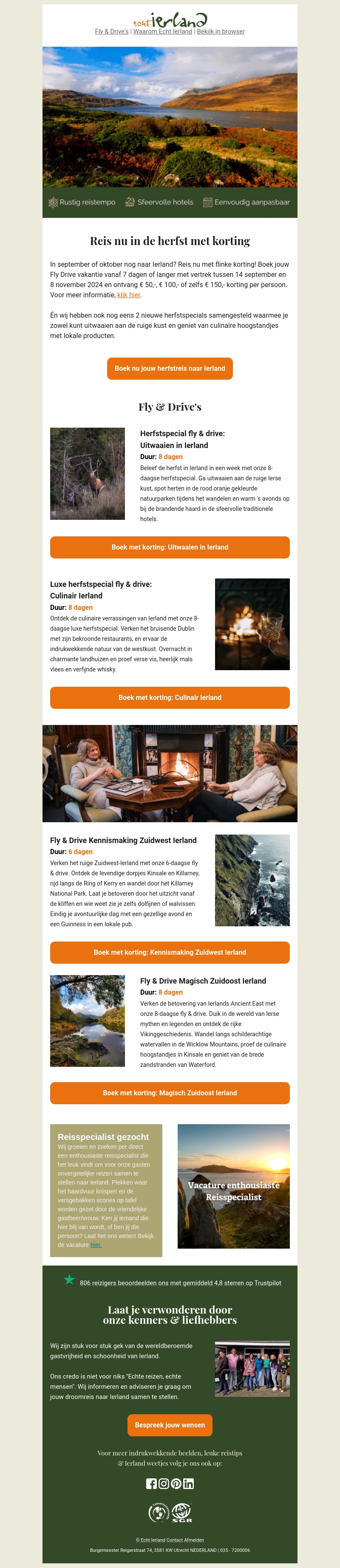 Reis deze herfst naar Ierland en profiteer van geweldige kortingen op Fly & Drive vakanties. Ontdek de mooiste landschappen, geniet van culinaire hoogstandjes en verblijf in sfeervolle hotels. Boek nu en ervaar de magie van Ierland!