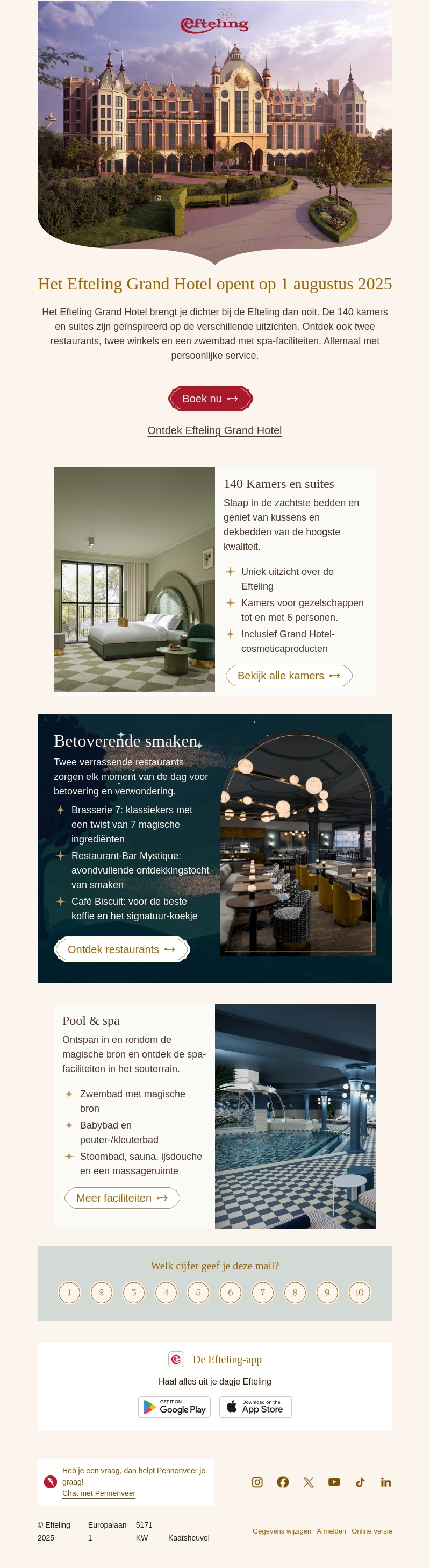 Het Efteling Grand Hotel opent op 1 augustus 2025 en biedt 140 luxe kamers en suites met een uniek uitzicht. Ontdek twee restaurants, een zwembad met spa-faciliteiten en geniet van ongeëvenaarde gastvrijheid. Boek nu uw verblijf voor een magische ervaring.