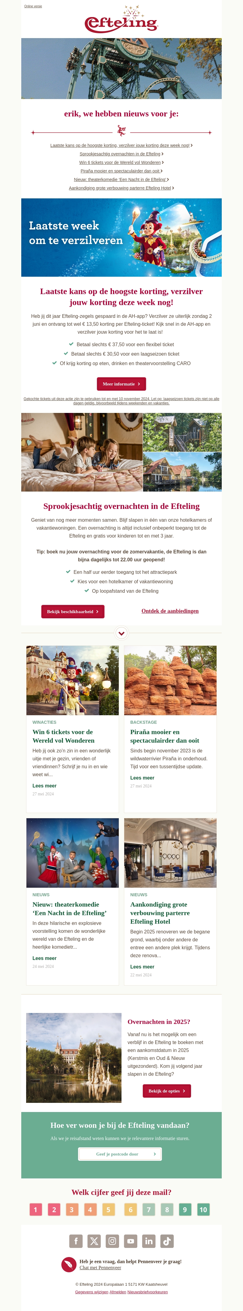 Erik, we hebben fantastisch nieuws voor je! Dit is je laatste kans om te profiteren van de hoogste korting en magische overnachtingen in de Efteling. Mis ook niet de kans om 6 tickets voor 'De Wereld vol Wonderen' te winnen. Ontdek de nieuwe attracties en theaterkomedies die op je wachten!