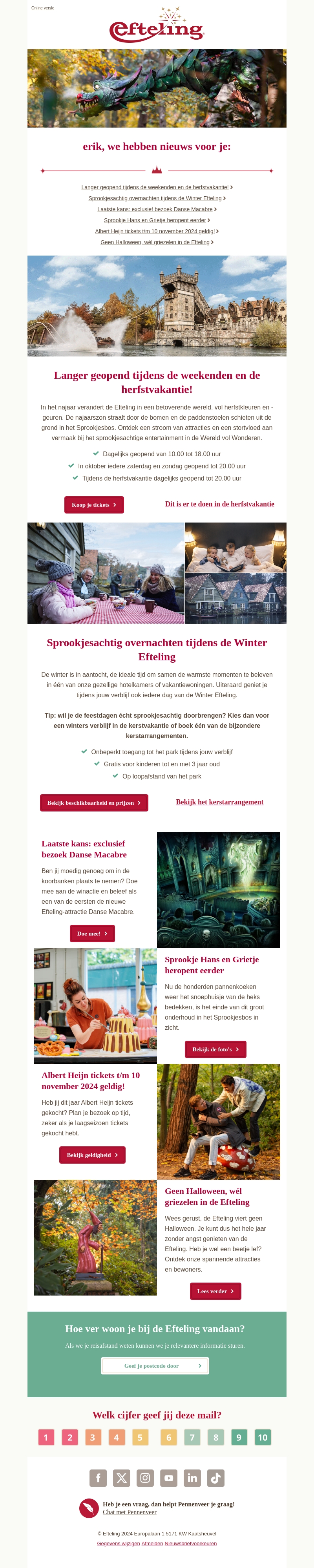 Beleef de magie van de herfst in Efteling met verlengde openingstijden en betoverende attracties. Mis de unieke kans niet op een exclusief bezoek aan de nieuwe Danse Macabre attractie. Geniet van sprookjesachtige overnachtingen tijdens de Winter Efteling. Ook Sprookjesbos biedt vernieuwde belevenissen met de terugkeer van Hans en Grietje. Halloween is niet eng, maar gezellig in de Efteling.