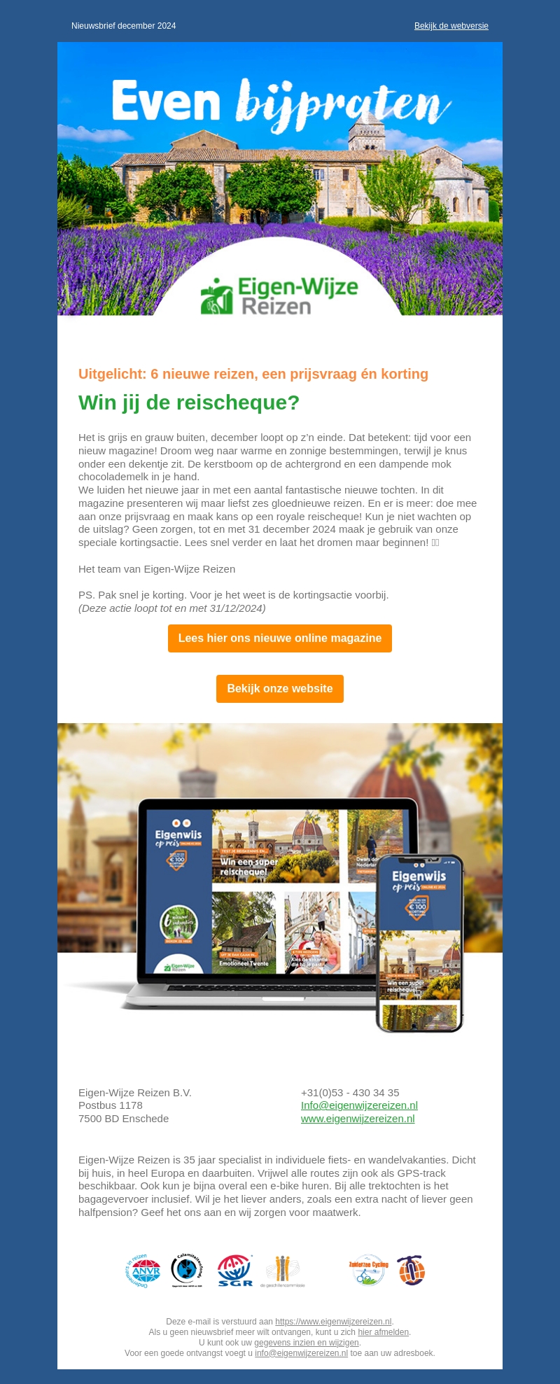 De december nieuwsbrief van Eigen-Wijze Reizen biedt zes opwindende nieuwe reisroutes aan. Ontsnap naar zonnige bestemmingen en neem deel aan een prijsvraag voor een geweldige reischeque. Maak gebruik van speciale kortingen die geldig zijn tot het einde van het jaar. Lees verder in het online magazine en plan je volgende avontuur.