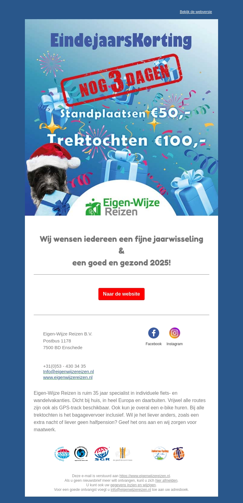 Ontdek nu de eindejaarskortingen bij Eigen-Wijze Reizen met kortingen op standplaatsen en trektochten. Geniet van fietsvakanties en wandeltochten door heel Europa, inclusief bagagevervoer. Boek snel binnen de volgende drie dagen en begin het nieuwe jaar met een avontuur!
