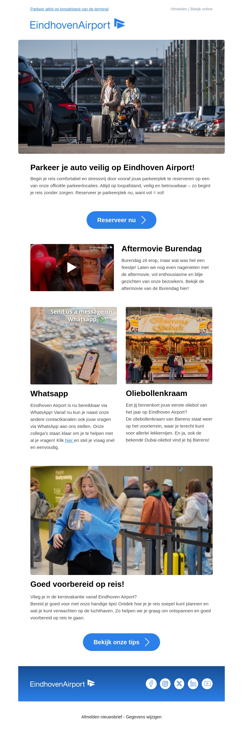 Bereid je reis voor met Eindhoven Airport! Reserveer gemakkelijk je parkeerplek, bekijk de aftermovie van Burendag en stuur ons je vragen via WhatsApp. Ontdek onze oliebollen tijdens de feestdagen en krijg reistips voor de kerstvakantie.
