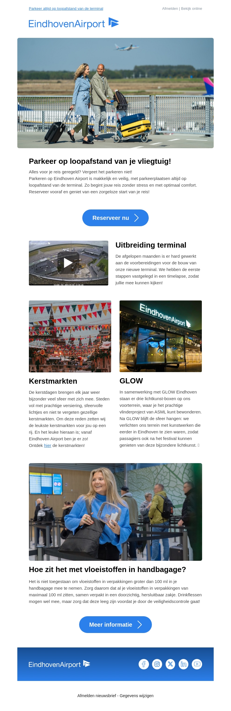 Begin je reis zonder stress door vooraf je parkeerplek bij Eindhoven Airport te reserveren. De parkeerplaatsen zijn op loopafstand van de terminal, wat je reis comfortabel en zorgeloos maakt. Ontdek ook de terminaluitbreiding en neem deel aan sfeervolle kerstmarkten en het GLOW festival. Blijf op de hoogte van de regels voor vloeistoffen in je handbagage en zorg voor een vlotte reiservaring.