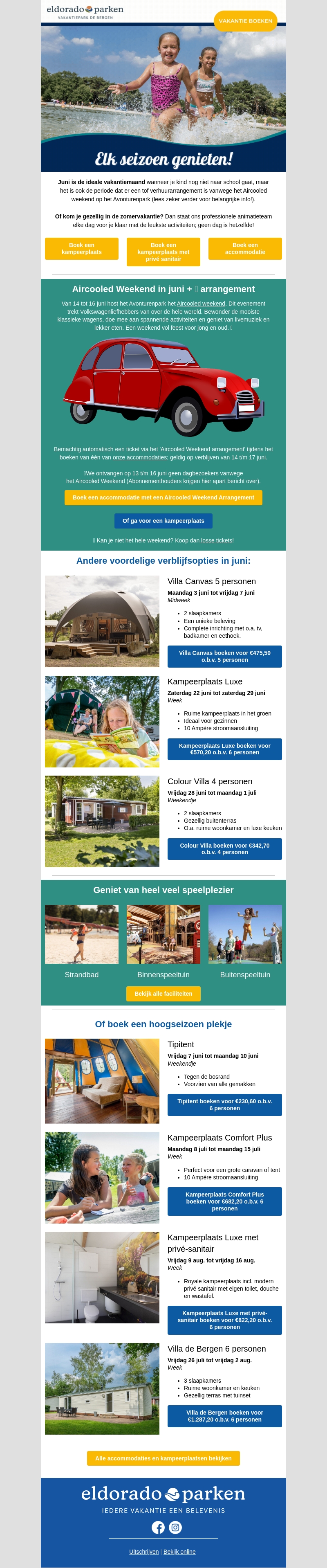 Juni is de ideale vakantiemaand met spannende weekendarrangementen, waaronder het Aircooled Weekend. Geniet van diverse accommodaties zoals Villa Canvas en Tipitent. Boek nu en beleef een onvergetelijke zomer bij Eldorado Parken!