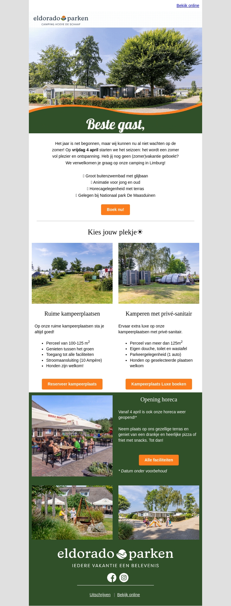 Begin je zomeravontuur bij Eldorado Parken vanaf 4 april. Geniet van ruime kampeerplaatsen, een groot zwembad, en animatie voor jong en oud. Onze horecagelegenheid opent ook haar deuren. Ontdek alle faciliteiten en boek nu je plek in Limburg, gelegen bij het prachtige Nationaal park De Maasduinen.