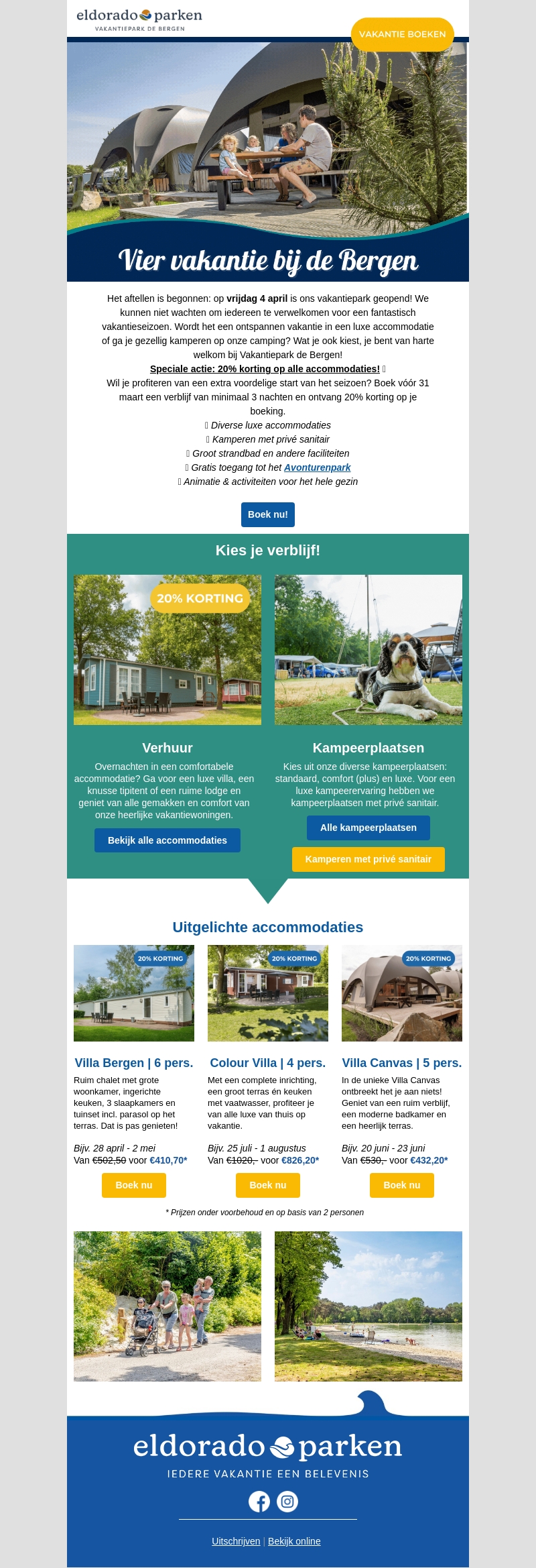 Vier je vakantie bij Vakantiepark de Bergen met een speciale actie van 20% korting op alle accommodaties. Of je nu kiest voor een luxe villa of een knusse kampeerplaats, er is voor ieder wat wils. Geniet van diverse voorzieningen zoals het avonturenpark en een groot strandbad. Boek voor 31 maart een verblijf van minimaal 3 nachten en profiteer van deze aanbieding. Ontspannen en plezier voor het hele gezin!