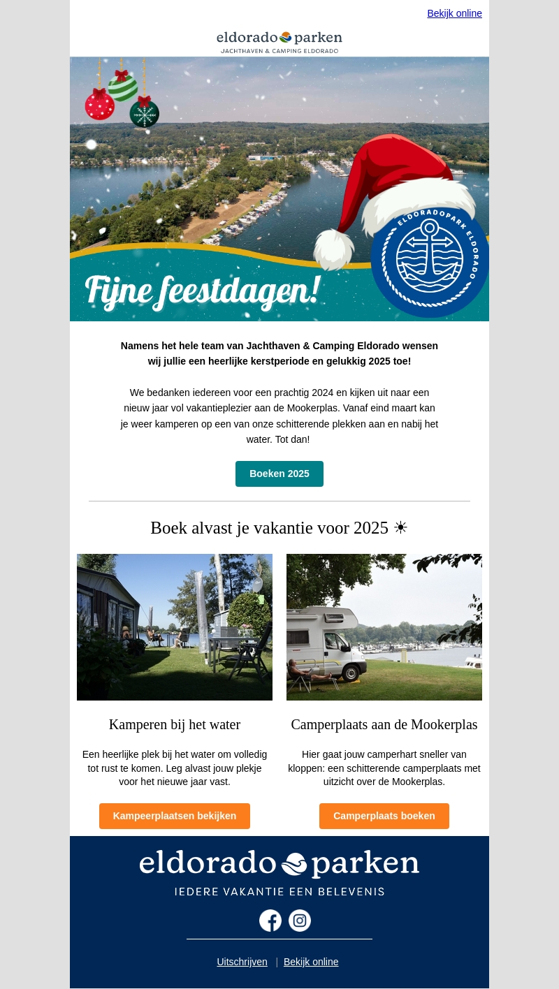 Eldorado Parken wenst je fijne feestdagen en een gelukkig nieuwjaar. Begin 2025 met ontspanning aan de Mookerplas, met schitterende kampeerplekken. Boek jouw vakantie nu en geniet van de rust bij het water. Check onze speciale locaties voor camperplaatsen en kom volledig tot rust.