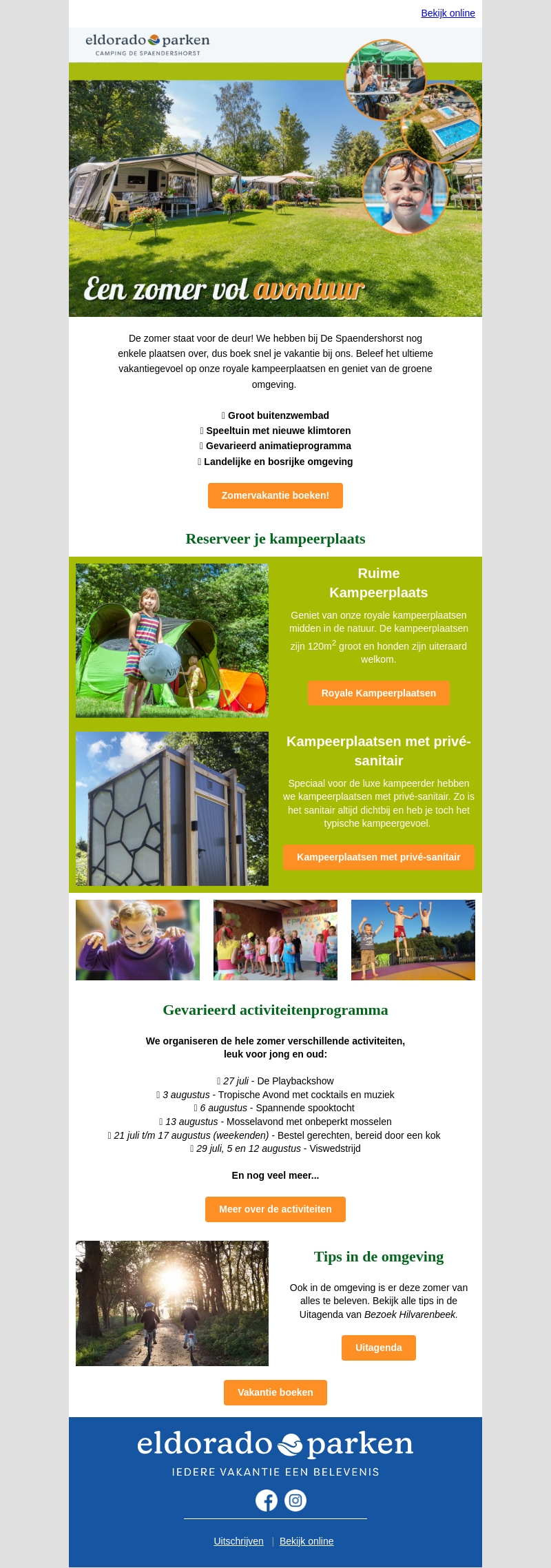 De zomer staat voor de deur! Boek je vakantie bij Eldorado Parken en geniet van onze ruime kampeerplaatsen en vele activiteiten. Van een groot buitenzwembad tot spannende spooktochten, er is voor ieder wat wils. Ontdek ook de prachtige omgeving met onze tips. Mis het niet en reserveer je plek vandaag nog!