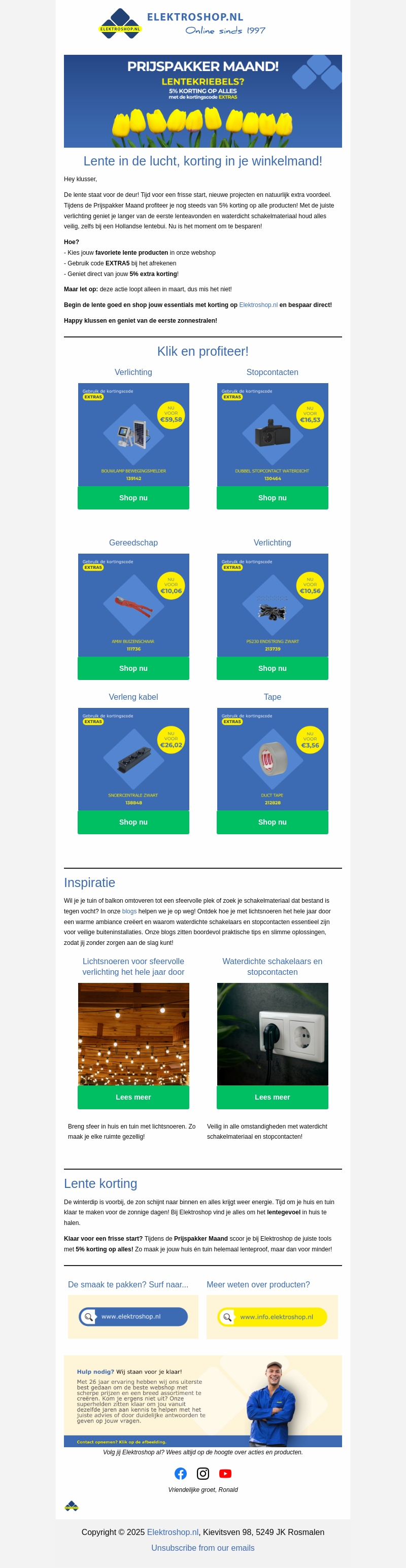 Maart is de Prijspakkermaand bij Elektroshop.nl! Geniet van een speciale korting van 5% op al onze producten. Of je nu je tuin wilt opfrissen of schakelmateriaal zoekt, we hebben alles wat je nodig hebt. Vergeet niet de kortingscode EXTRA5 te gebruiken bij je aankoop. Begin de lente met geweldige deals en bespaar onmiddellijk!