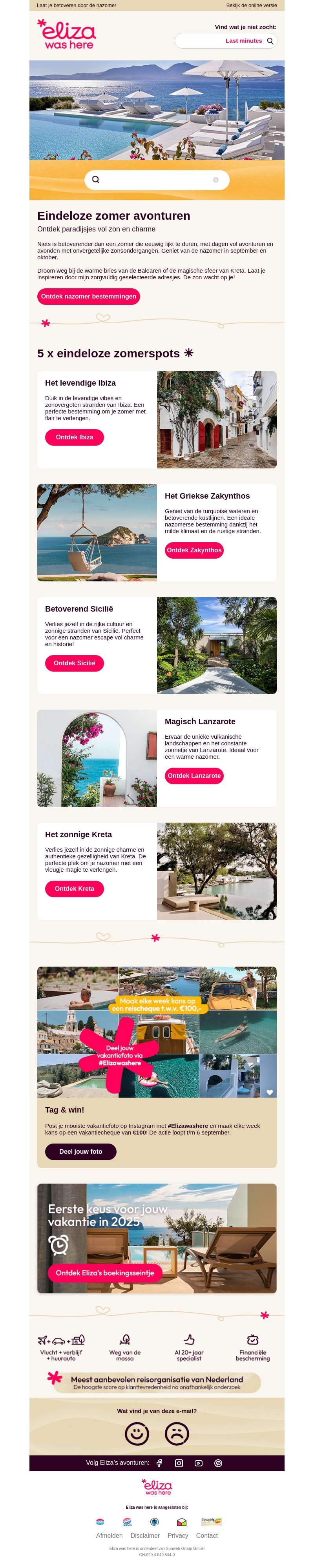 Verleng je zomer met de fantastische bestemmingen van Eliza Was Here. Ontdek Ibiza, Zakynthos, Sicilië, en meer terwijl je geniet van de zon en charme van deze paradijselijke plekken. Ook zijn er wekelijkse reischeques te winnen!