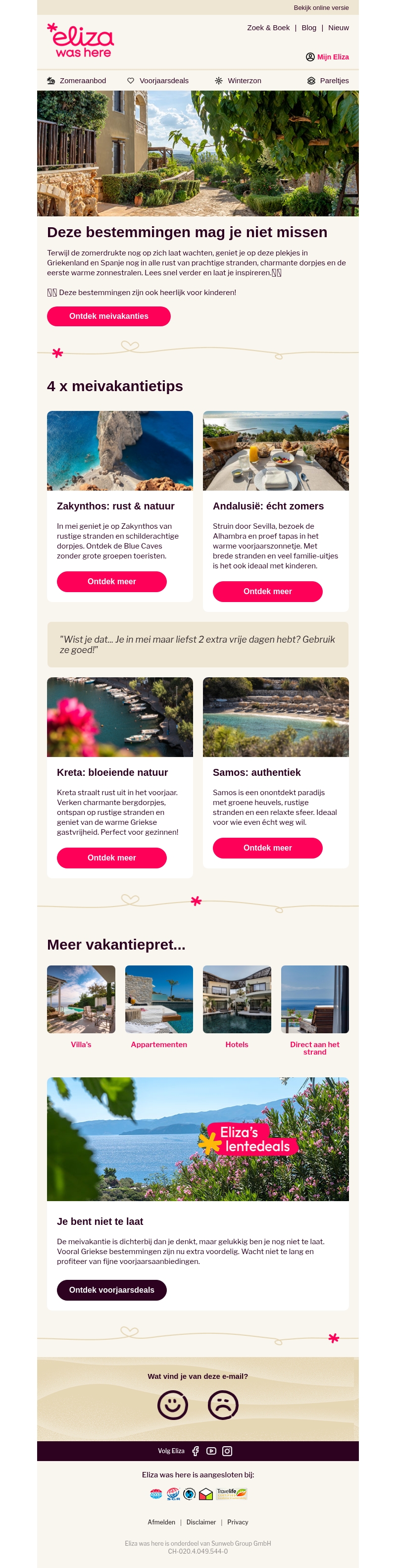 De meivakantie staat voor de deur en wij hebben de beste tips voor je verzameld. Verken de rustige stranden van Zakynthos en de zonnige pleinen van Andalusië. Ontdek de bloeiende natuur van Kreta en de authenticiteit van Samos. Mis ook onze voordelige lenteaanbiedingen niet. Gebruik deze kans voor een geweldige vakantie-ervaring.