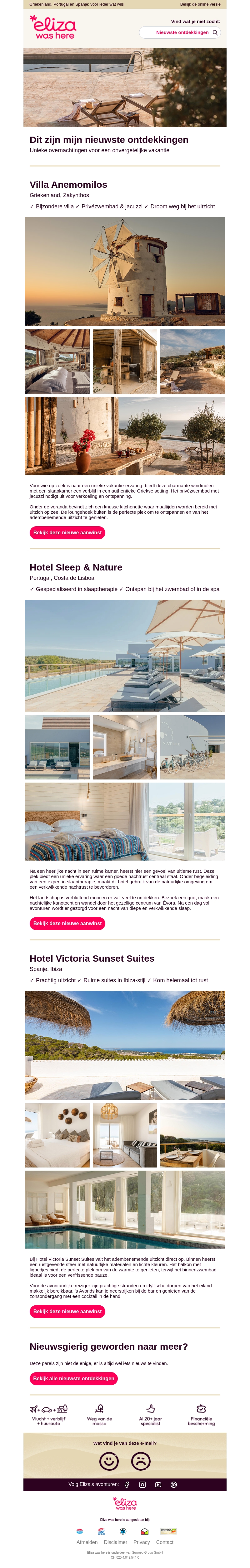 Ontdek drie unieke nieuwe vakantiebestemmingen met Eliza was Here: Villa Anemomilos in Zakynthos, Hotel Sleep & Nature in Costa de Lisboa, en Hotel Victoria Sunset Suites in Ibiza. Elk biedt unieke ervaringen en luxe faciliteiten voor een onvergetelijke vakantie. Lees verder om meer te weten te komen over deze betoverende plekken.