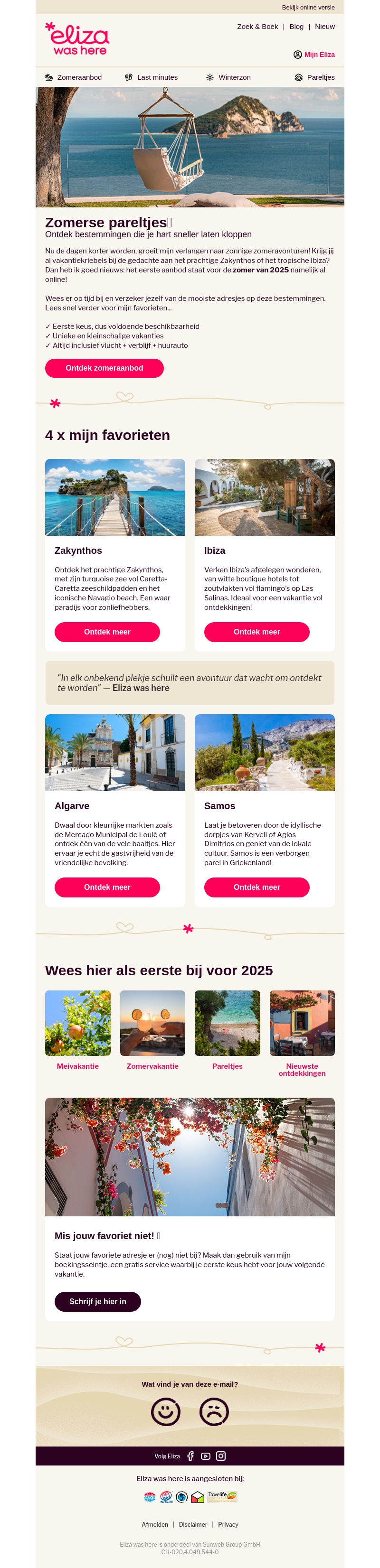 Nu de dagen korter worden, groeit misschien jouw verlangen naar zonnige zomervakanties. In deze nieuwsbrief stellen wij je vier prachtige bestemmingen voor: Zakynthos, Ibiza, Algarve, en Samos. Wees als eerste op de hoogte en ontdek de mooiste verborgen parels voor zomer 2025. Mis jouw favoriete adresje niet, en maak gebruik van onze boekingsservice.