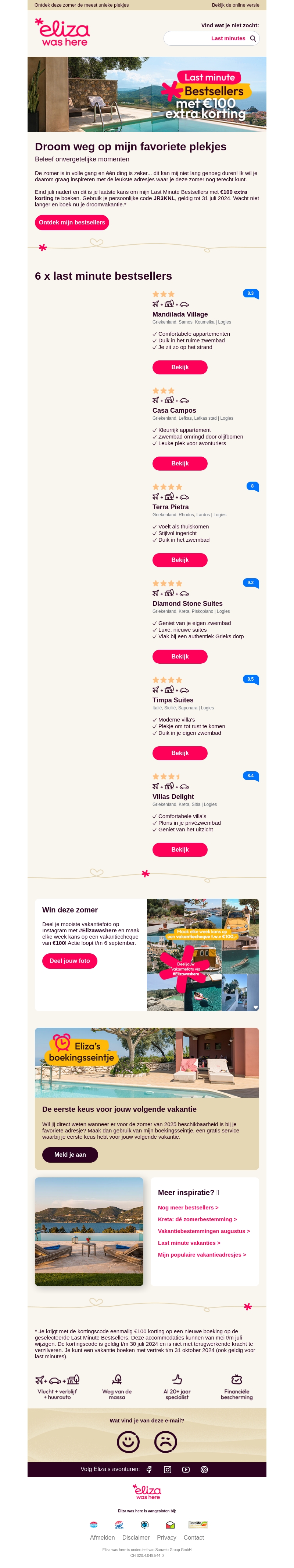 De zomer is volop aan de gang en dit is jouw laatste kans om te genieten van onze beste last minute vakantiedeals! Ontdek fantastische bestemmingen met een extra korting van €100. Beschikbaar tot 31 jul 2024. Boek snel en droom weg op jouw favoriete plekjes!