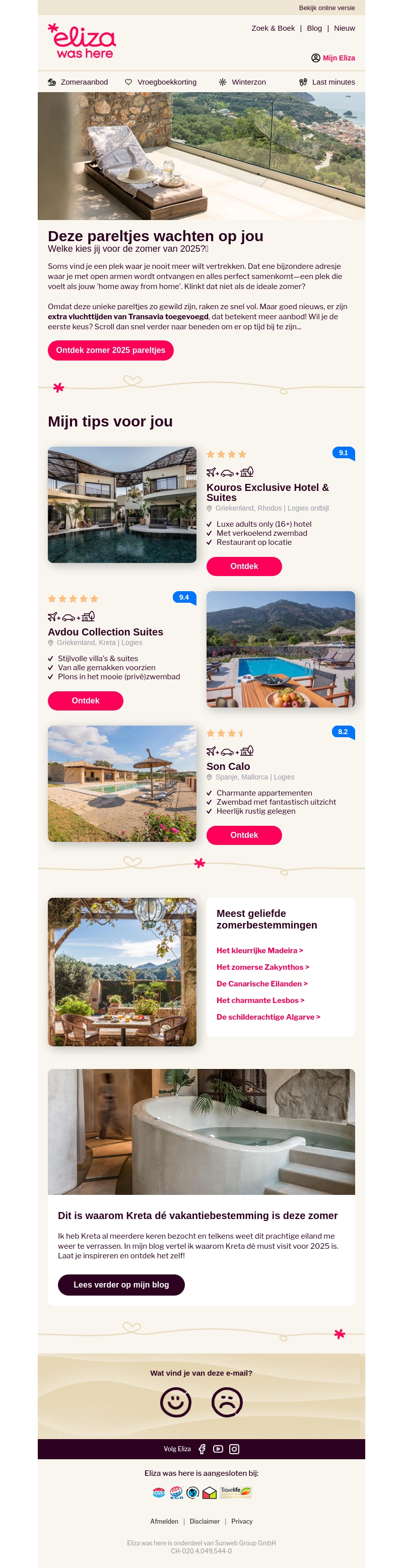 Mis deze pareltjes voor zomer 2025 niet! Ontdek unieke vakantiebestemmingen waar je open armen ontvangt en alles perfect samenkomt. Kies uit exclusieve hotels en charmante suites, ideaal voor een onvergetelijke vakantie-ervaring. Grijp je kans en boek je verblijf bij Eliza was here.