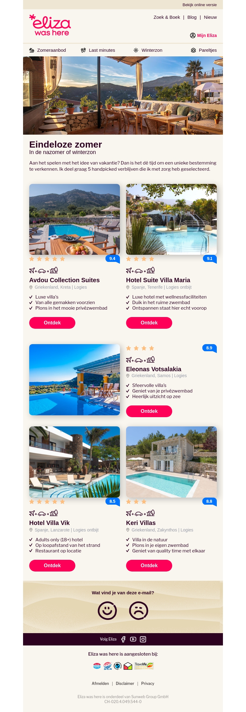 Verlang je naar een unieke vakantie? Ontdek vijf zorgvuldig geselecteerde verblijven die ideaal zijn voor jouw eindeloze zomer. Van luxe villa's op Kreta tot sfeervolle villa's op Samos, deze bestemmingen bieden comfort en ontspanning. Duik in prachtige privézwembaden en geniet van fenomenale uitzichten.