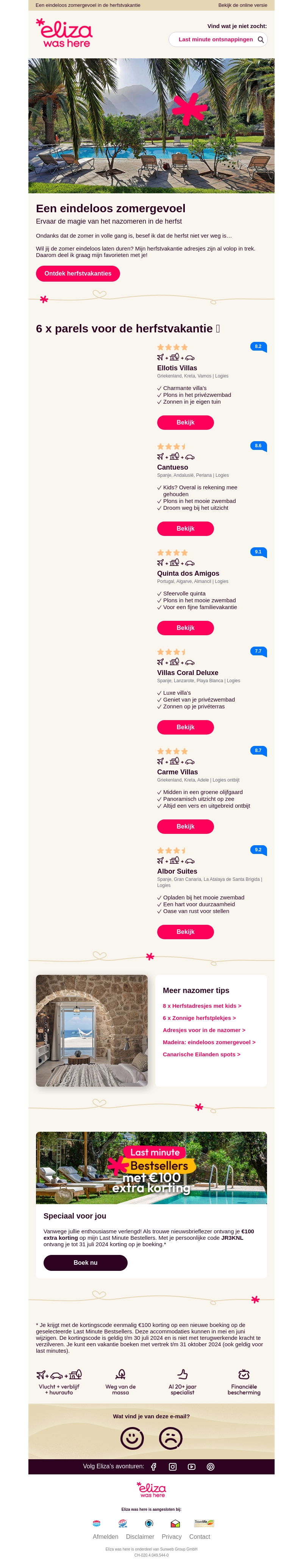 Ervaar de magie van het nazomeren met Eliza was here! Ondanks dat de zomer ten einde loopt, zijn er nog tal van prachtige vakantiebestemmingen te ontdekken. Bekijk onze speciale selectie van 6 parels voor de herfstvakantie. Ontvang ook €100 korting op Last Minute Bestsellers met de code JRAKNL. Boek nu en verleng de zomer!