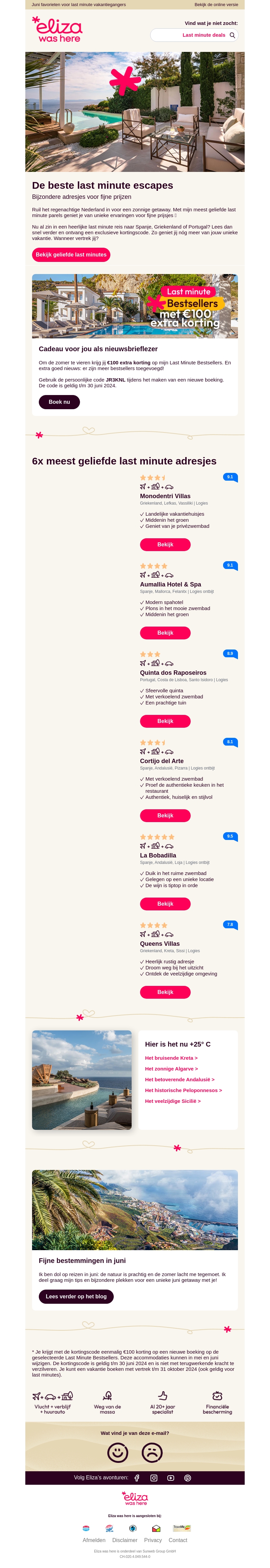 Profiteer nu van €100 extra korting op geselecteerde Last Minute Bestsellers. Ontsnap naar prachtige bestemmingen zoals Spanje, Griekenland en Portugal. Boek voor 31 oktober 2024 en geniet van onvergetelijke momenten.