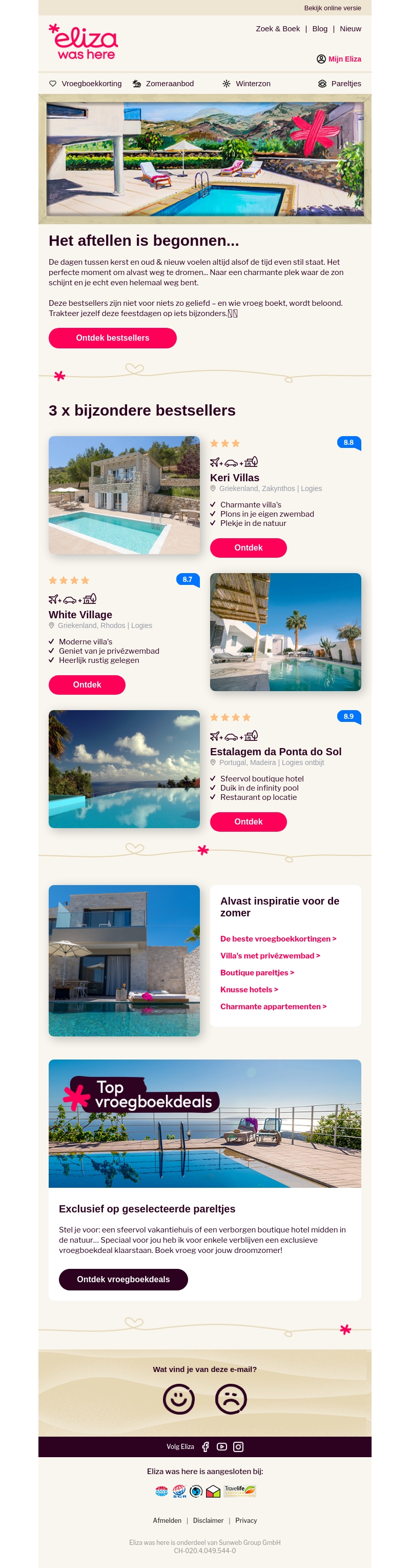 De dagen tussen kerst en oud & nieuw zijn ideaal voor dromen over zonnige bestemmingen. Eliza was here biedt een selectie van meest geliefde vakantieplekken voor de perfecte wintertrip. Ontdek charmante villa's, moderne hotels en exclusieve vroegboekdeals. Trakteer jezelf op een bijzondere vakantie-ervaring en boek je droomverblijf vandaag nog.