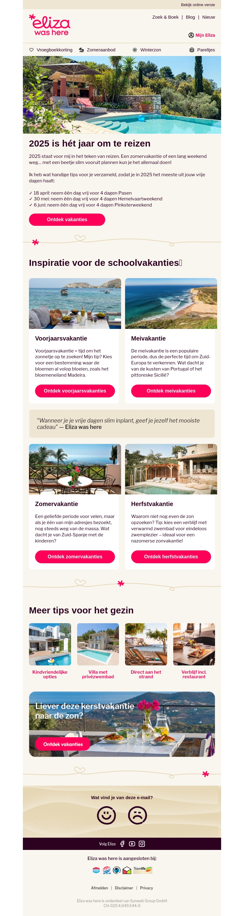 2025 is hét jaar om te reizen! Met slimme tips kun je optimaal gebruik maken van je vakantiedagen. Of je nu kiest voor een zomervakantie, een kort weekendje weg of schoolvakanties, er zijn volop mogelijkheden. Bekijk de tips voor voorjaars-, mei-, zomer- en herfstvakanties. Verwen jezelf en je gezin met onze speciale aanbiedingen.