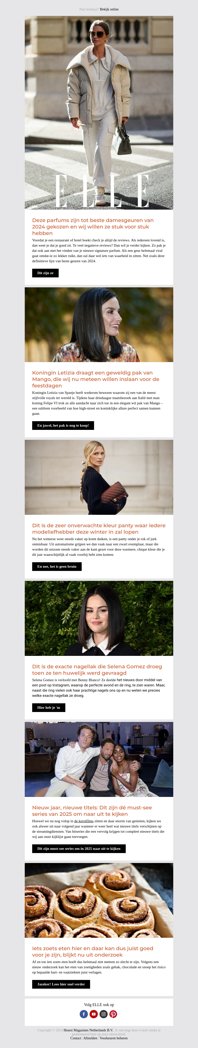 Ontdek welke parfums zijn verkozen tot de beste damesgeuren van 2024. Frisse en betoverende geuren die zeker in jouw collectie passen. Zie ook de stijltips van beroemde stijliconen zoals Koningin Letizia en verrassende modetrends. Blijft op de hoogte met onze aanbevelingen voor tv-series en zoetigheden die goed voor je kunnen zijn.