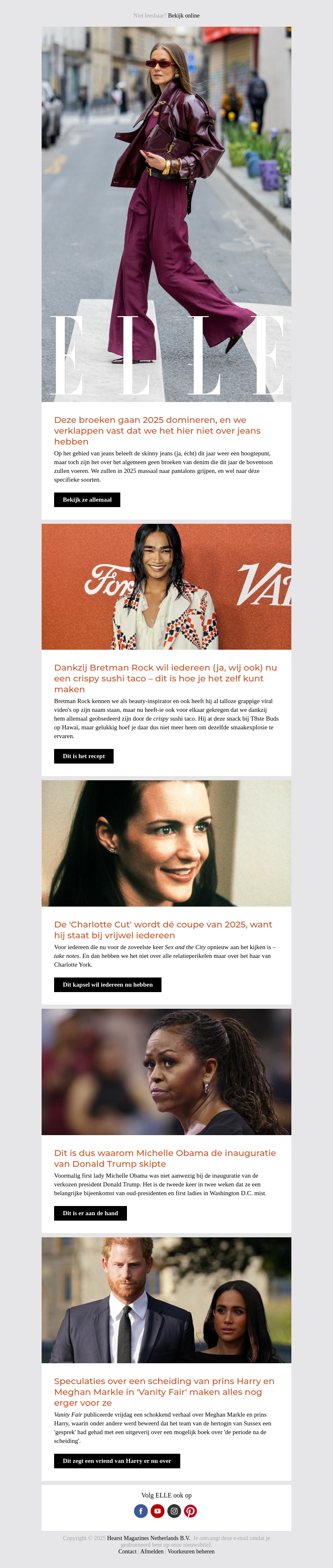 In deze ELLE nieuwsbrief ontdek je de modegeheimen voor 2025 met de nieuwste jeans trends en de 'Charlotte Cut' coupe. Ontmoet celebrity Bretman Rock met zijn crispy sushi taco’s en lees het echte verhaal achter Michelle Obama’s afwezigheid bij Trump’s inauguratie. Mis de sappige roddels over prins Harry en Meghan Markle niet.