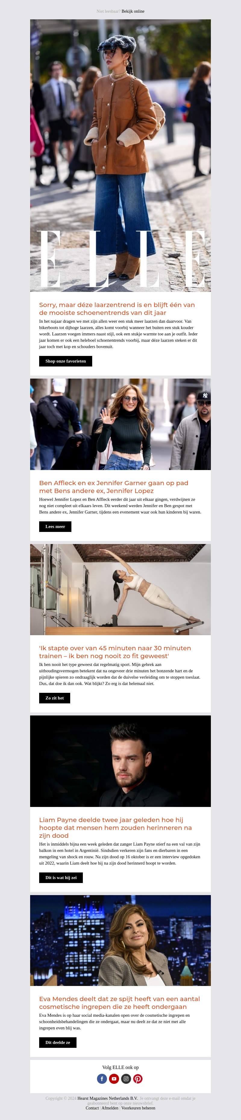 Deze nieuwsbrief brengt je de nieuwste mode-inzichten en verhalen uit de celebritywereld. Ontdek waarom laarzen trendy blijven en lees over de avonturen van Ben Affleck en Jennifer Garner. Vind inspiratie met fitnesstips en persoonlijke verhalen van Liam Payne en Eva Mendes.