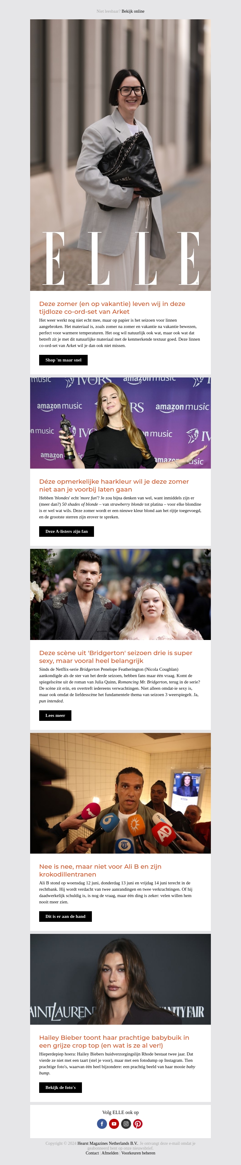 Ontdek deze zomer de tijdloze co-ord-set van Arket en een opvallende haarkleur die je niet mag missen. Duik in de sexy en belangrijke scènes van 'Bridgerton' seizoen drie en lees meer over Ali B's recente rechtszaak. Bekijk ook de prachtige babybuik van Hailey Bieber.