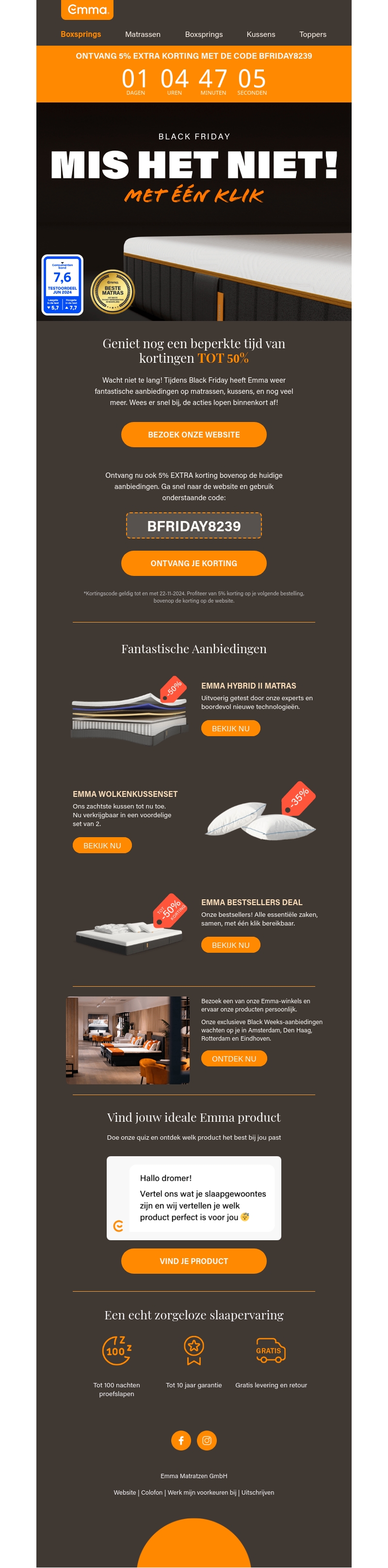 Mis de kans niet om te profiteren van geweldige Black Friday deals bij Emma. Bespaar tot 50% op matrassen en andere producten. Ontdek exclusieve aanbiedingen en geniet van comfort en kwaliteit voor minder. Grijp nu je kans voordat de aanbiedingen eindigen!